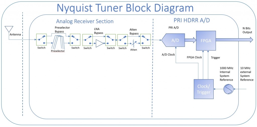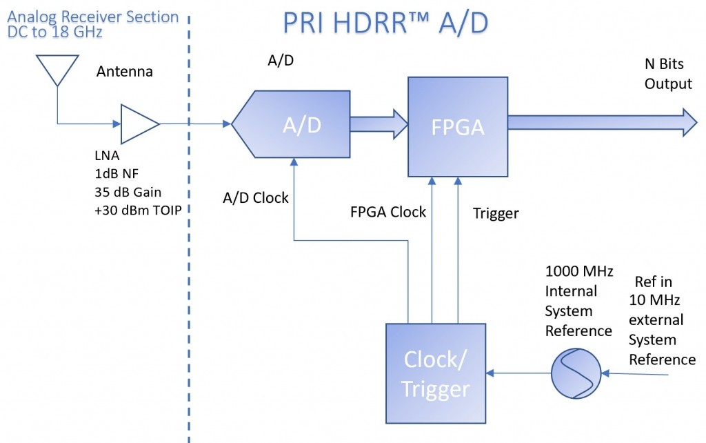 Precision Receivers inc. has studied a novel sampling technique which results in a form of non-uniform sampling. In non-uniform sampling, a data set is collected which is comprised of data points sampled at non-constant sample periods. Collecting samples with a non-uniform clock allows for more things to be known about the signal such as which Nyquist zone the signal is in. Nyquist theory assumes you only know one thing about a signal. The knowing of more than one thing about a signal allows HDRR™ technology to know which Nyquist zone a signal is in. With HDRR™ tuning in the different Nyquist zones is as simple as tweaking algorithm coefficients. Figure 1 is a simplified block diagram utilizing HDRR™ technology.